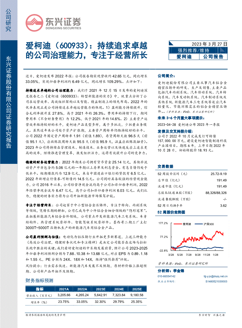 公司研究东兴证券股份无限公司证券研究演讲爱柯迪(600933):持续逃求杰出的公司管理能力,专注于运营所长 2023年3月27日强烈保举/维持 爱柯迪公司演讲近日,爱柯迪发布2022年报:公司演讲期实现营收约42。65亿元,同比增加33。05%,同比增加109。29%。