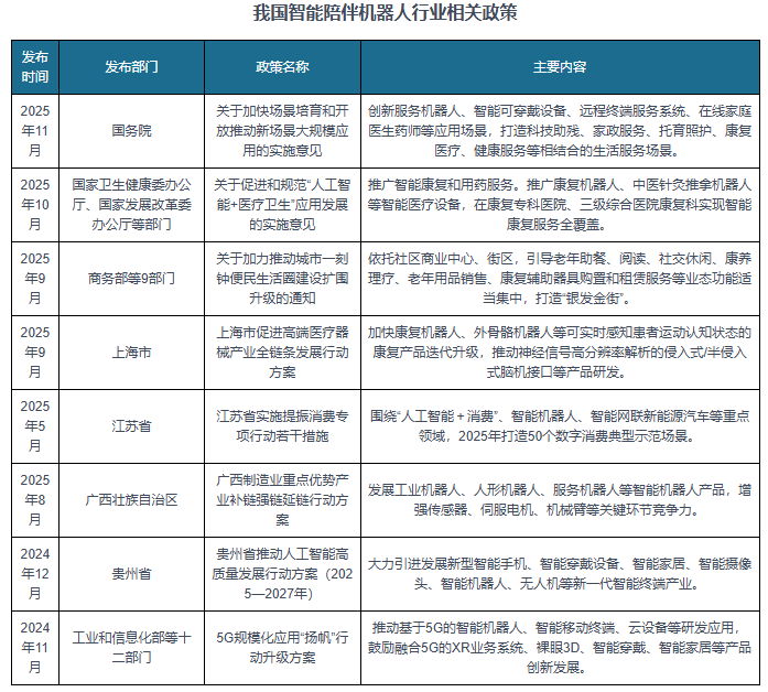 政策方面,近年来我国智能陪同机械人行业相关政策频出,使用场景不竭扩展。如2025年11月国务院印发的《关于加速场景培育和鞭策新场景大规模使用的实施看法》,立异办事机械人、智能可穿戴设备、近程终端办事系统、正在线家庭大夫药师等使用场景,打制科技帮残、家政办事、康复医疗、健康办事等相连系的糊口办事场景。